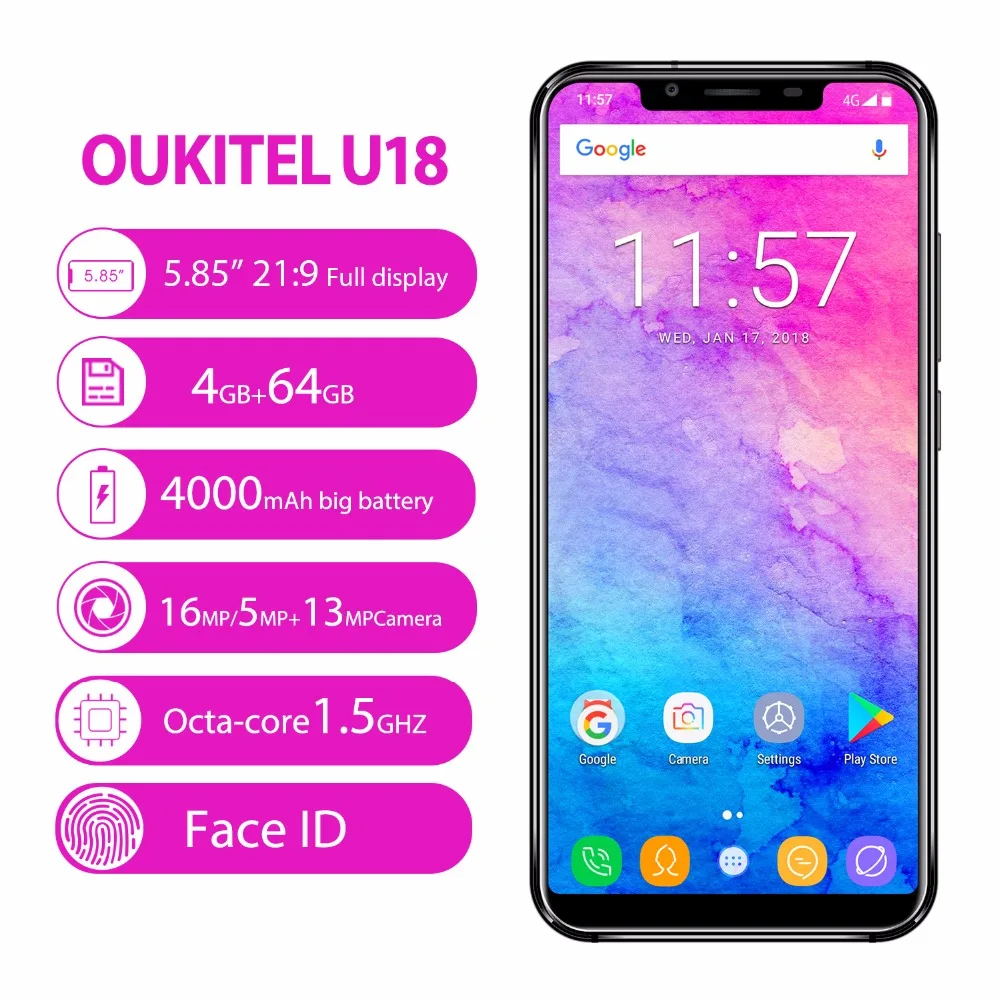 Comprar LTE 4g Oukitel U18 5.85 \"219 Smartphones Exibição Completa Face ID MT6750T 4 Octa Núcleo Android 7.0 gb 64 gb 13MP Dual SIM Do Telefone Móvel Baratas Online Preço.