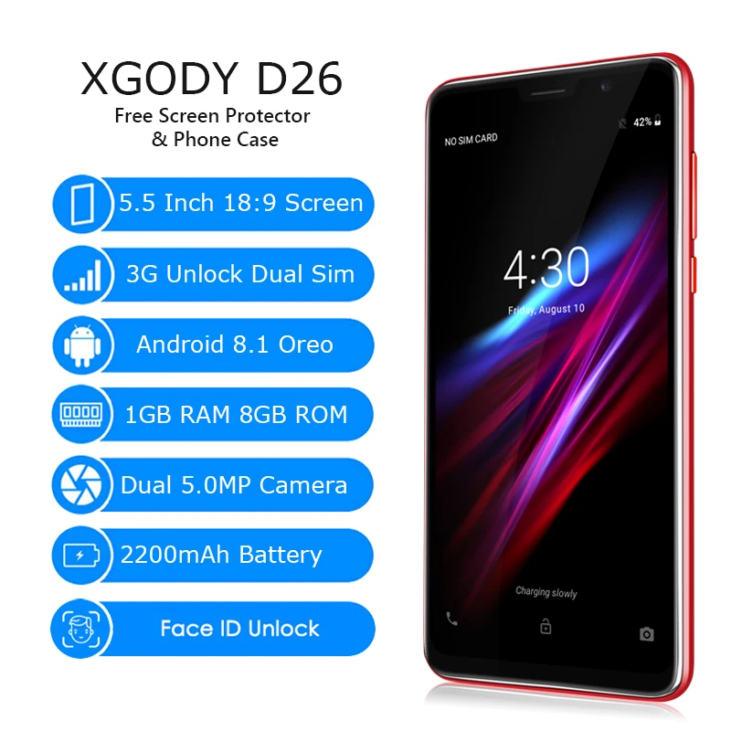 Comprar XGODY D26 Smartphone 5.5 Polegada 189 Android 8.1 Telefone Móvel Dual Sim Quad Core 1 gb + 8 gb 2200 mah GPS Rosto ID 3g Desbloquear Celulares Baratas Online Preço.