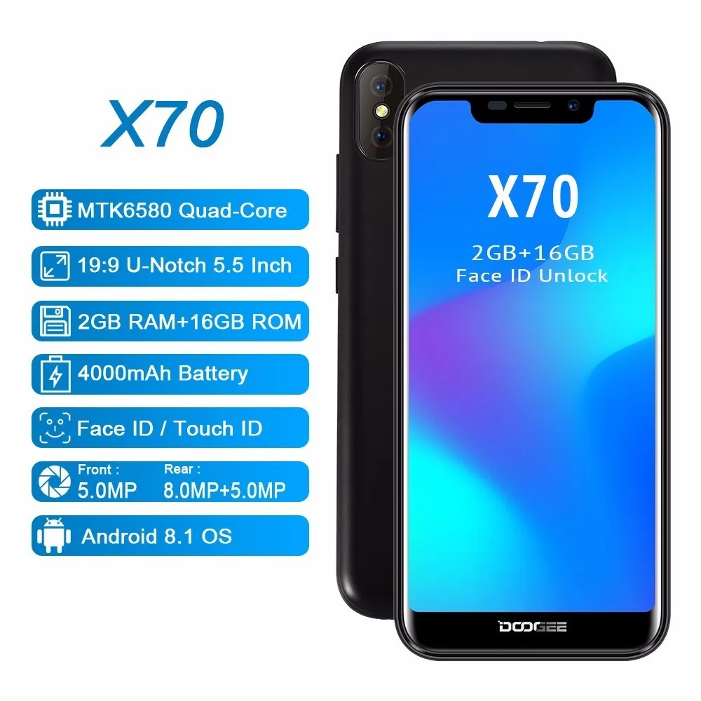 Comprar DOOGEE Smartphones X70 Rosto 199 MTK6580 Quad Core 16 2 gb RAM gb ROM Android 8.1 Dual Camera 8.0MP 4000 mah 5.5 polegada Do Telefone Móvel Baratas Online Preço.