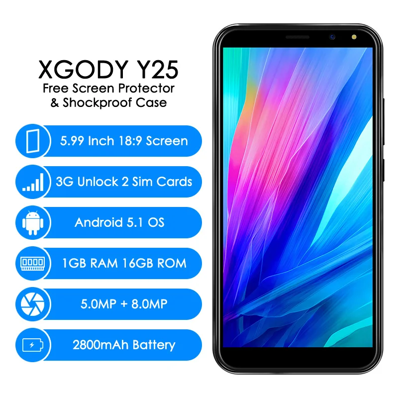 Comprar Original XGODY Y25 3g Desbloquear Smartphone 5.99 gb + 16 Polegada 189 Quad Core 1 gb Android Telefone 2800 mah Móvel Celular Telefone Celular Baratas Online Preço.