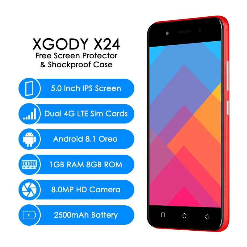 Comprar XGODY X24 Dual 5 Polegada 4g LTE Smartphones Android 8.1 Oreo MTK6739 Quad Core 1 gb + 8 gb 2500 mah Mobile Phone Bluetooth 4.0 Celular Baratas Online Preço